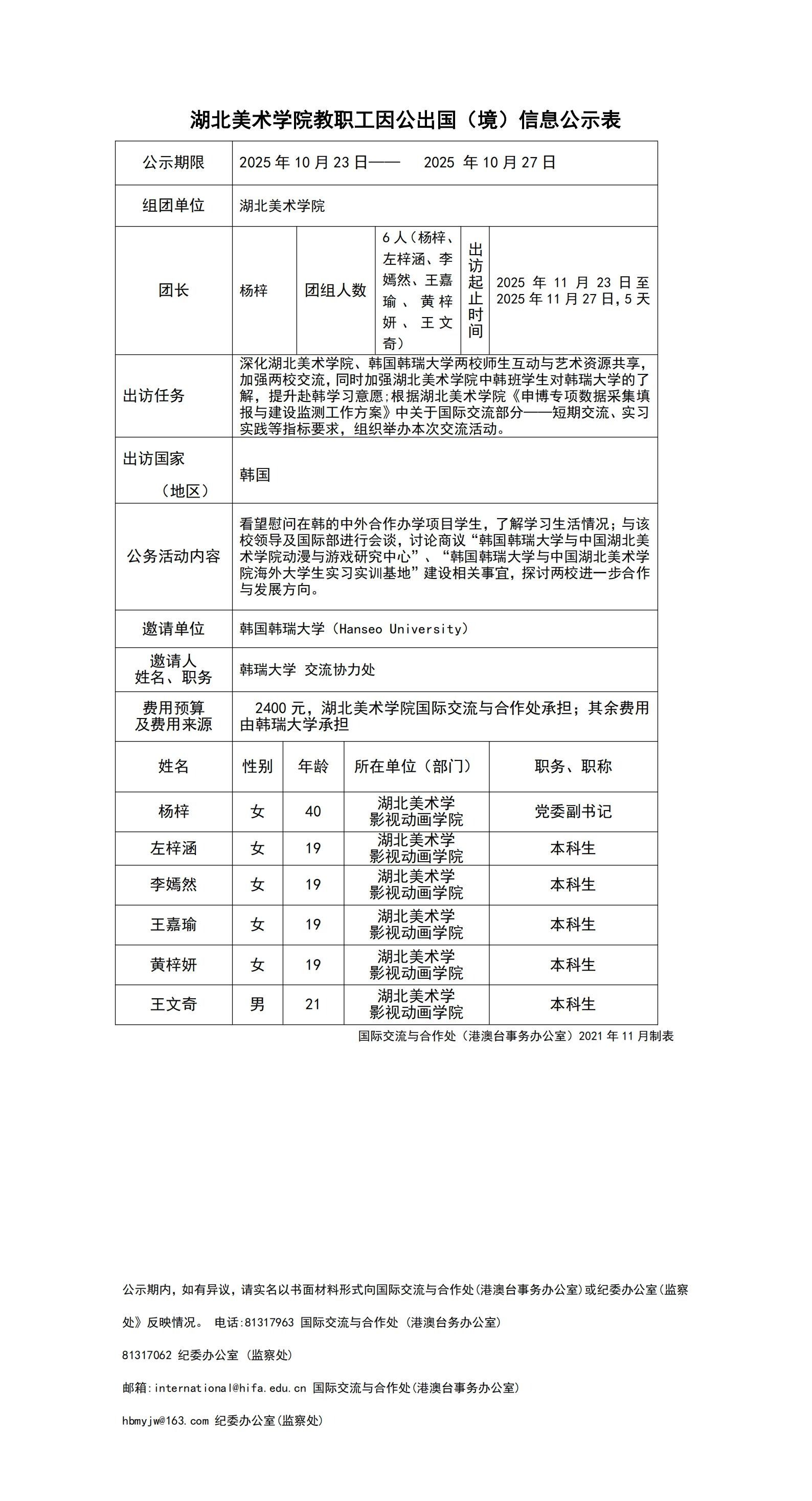 湖北美术学院教职工因公出国(境)公示信息(杨梓)