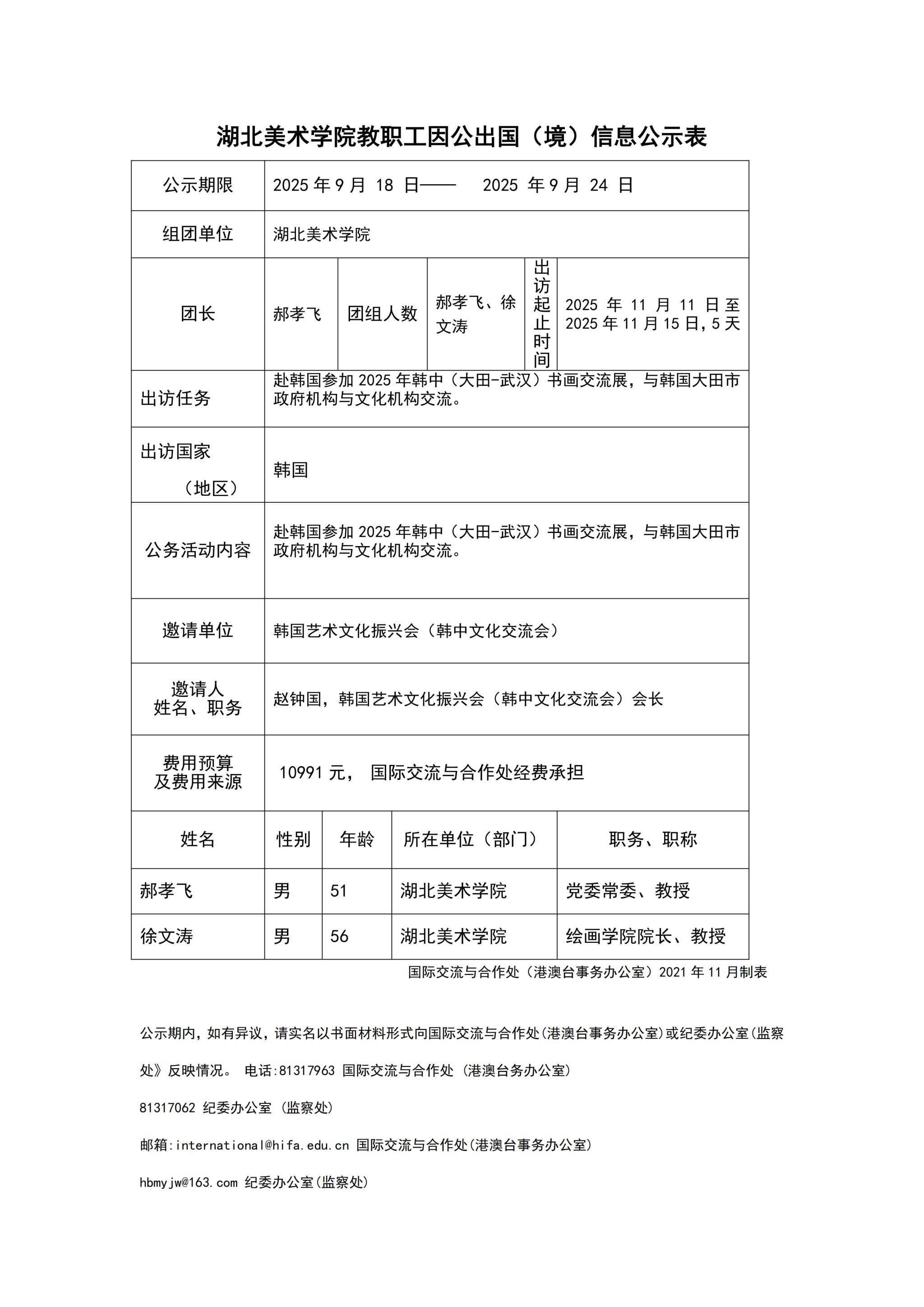 湖北美术学院教职工因公出国(境)公示信息(郝孝飞)