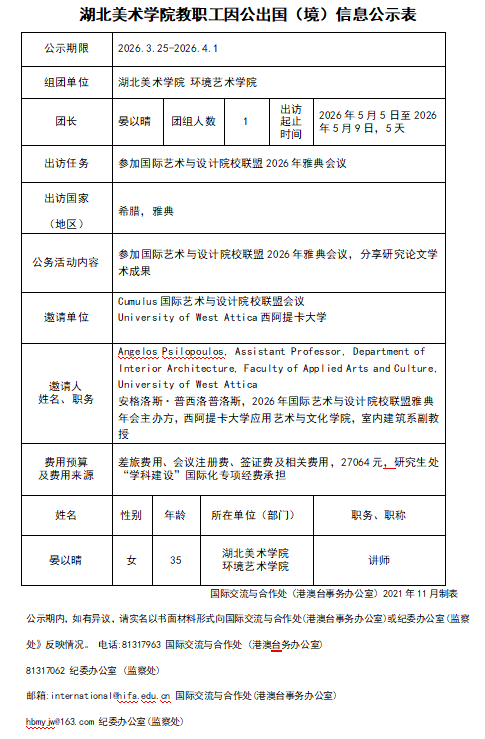 湖北美术学院教职工因公出国(境)信息公示表(晏以晴)