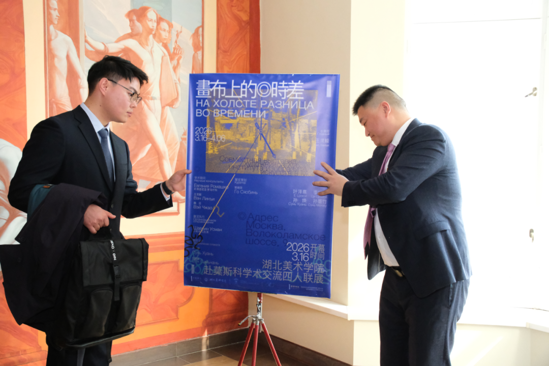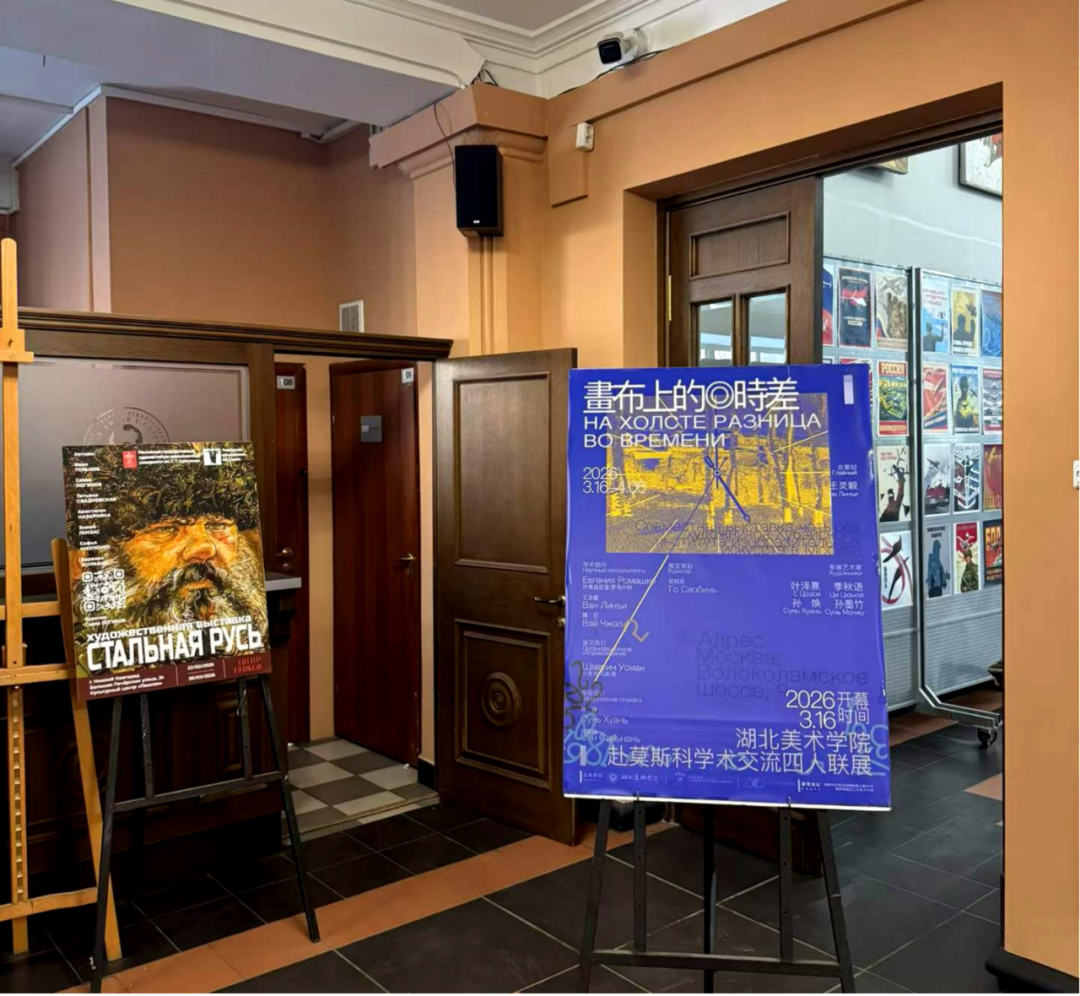 当地时间2026年3月16日上午,由湖北美术学院艺术教育学院与俄罗斯国立工艺美术大学联合主办的“画布上的时差——湖北美术学院赴莫斯科学术交流四人联展”在俄罗斯国立工艺美术大学展厅开幕。作为学校三个月以上学期交流项目的重要成果之一,本次展览集中呈现了我校4名赴俄交换青年艺术家叶泽熹、季秋语、孙焕、孙墨竹在俄交流学习期间创作的30余幅油画及综合材料静物作品,充分展现了我校青年学子在跨文化艺术语境中的探索与成长。