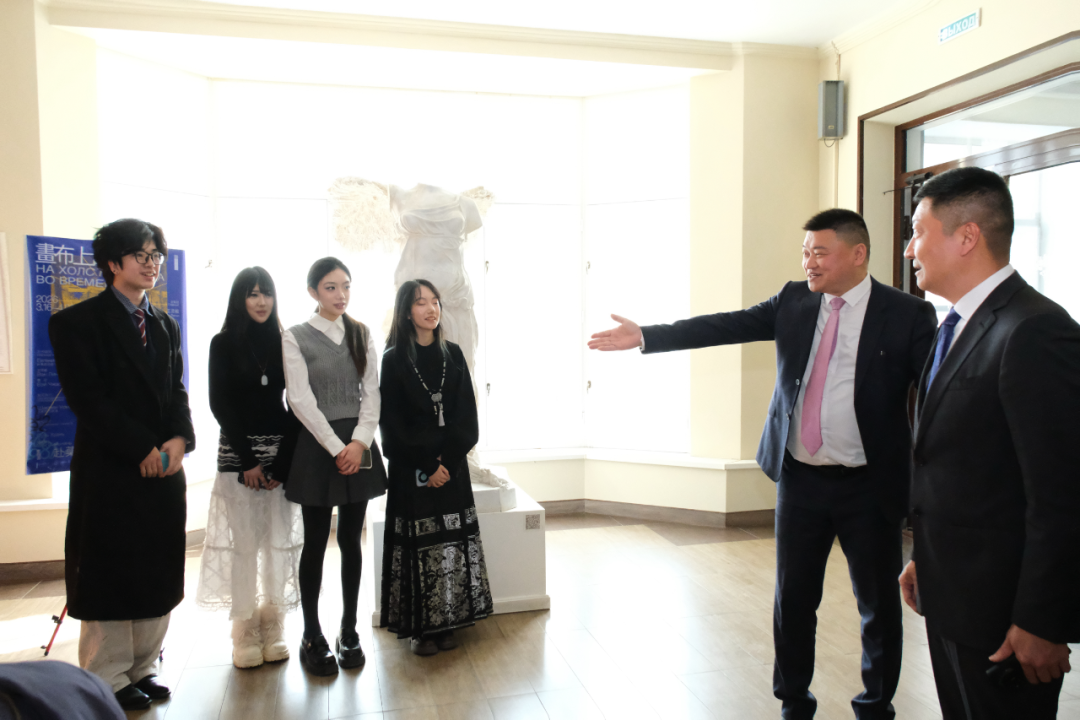 展览期间,中国人民大学党委书记张东刚率代表团到访俄罗斯国立工艺美术大学并参观展览,与4位青年艺术家亲切交流,详细了解其在俄学习、生活与创作情况,对青年学子坚持创作、勇于探索的精神风貌和此次联展的交流意义给予充分肯定。