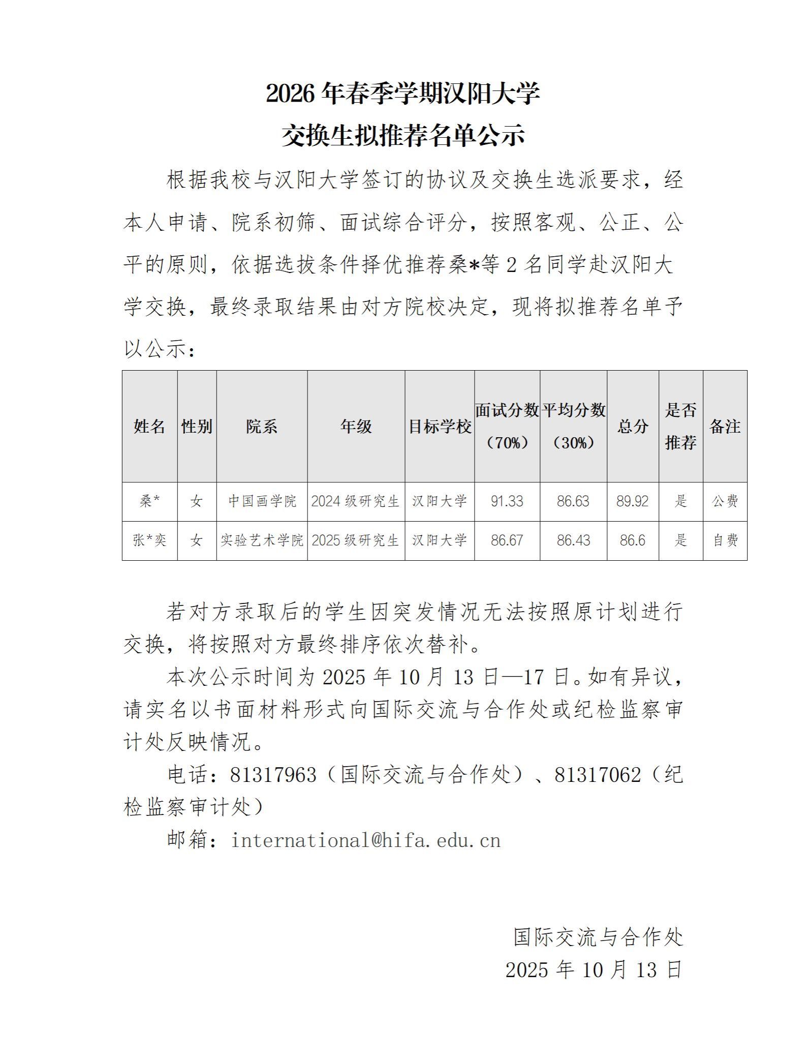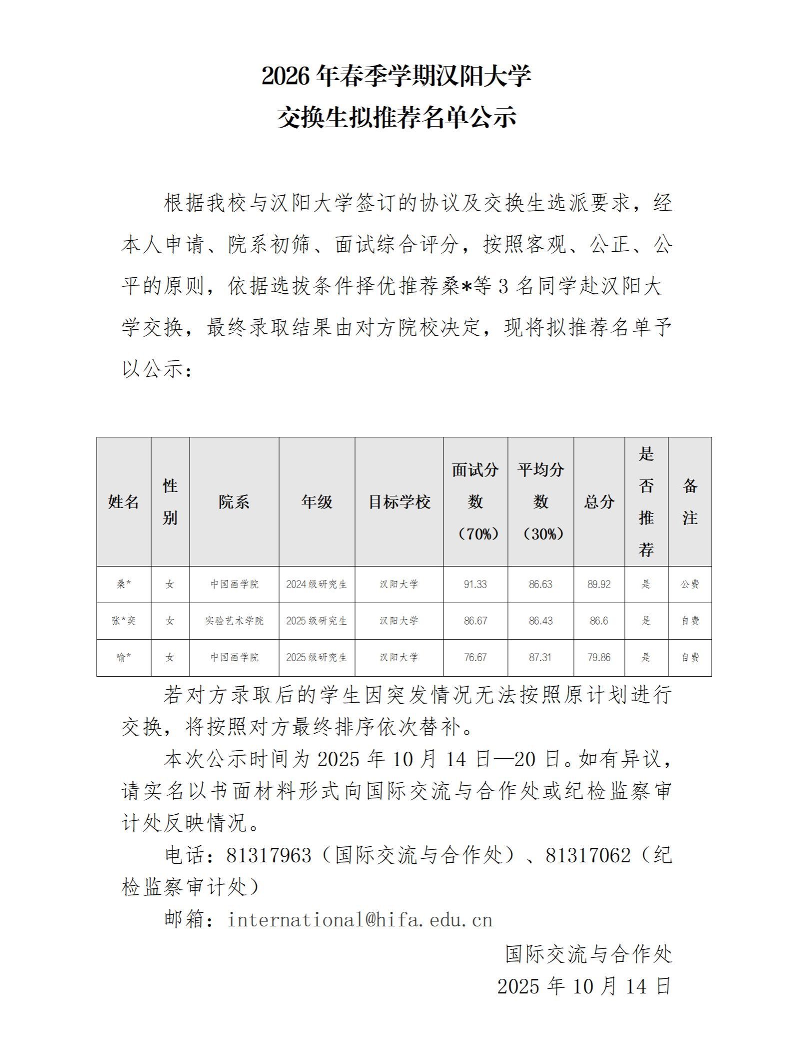 2026年春季学期汉阳大学交换生拟推荐名单公示