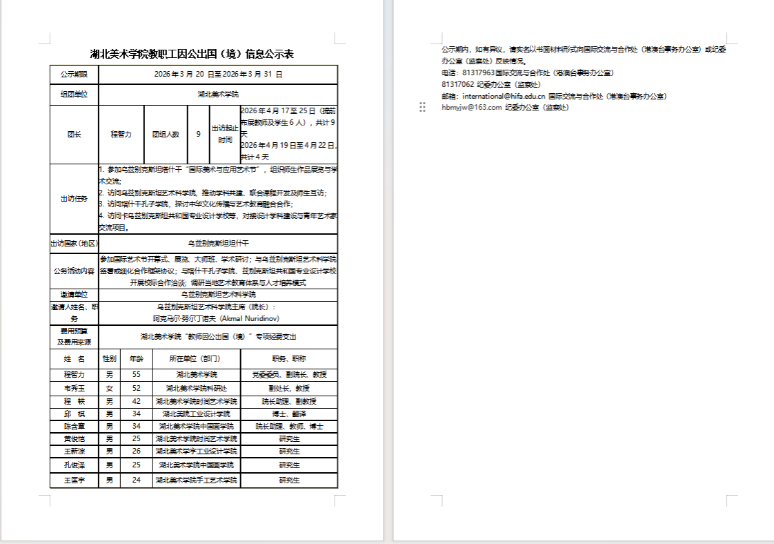 湖北美术学院教职工因公出国(境)信息公示表(程智力)