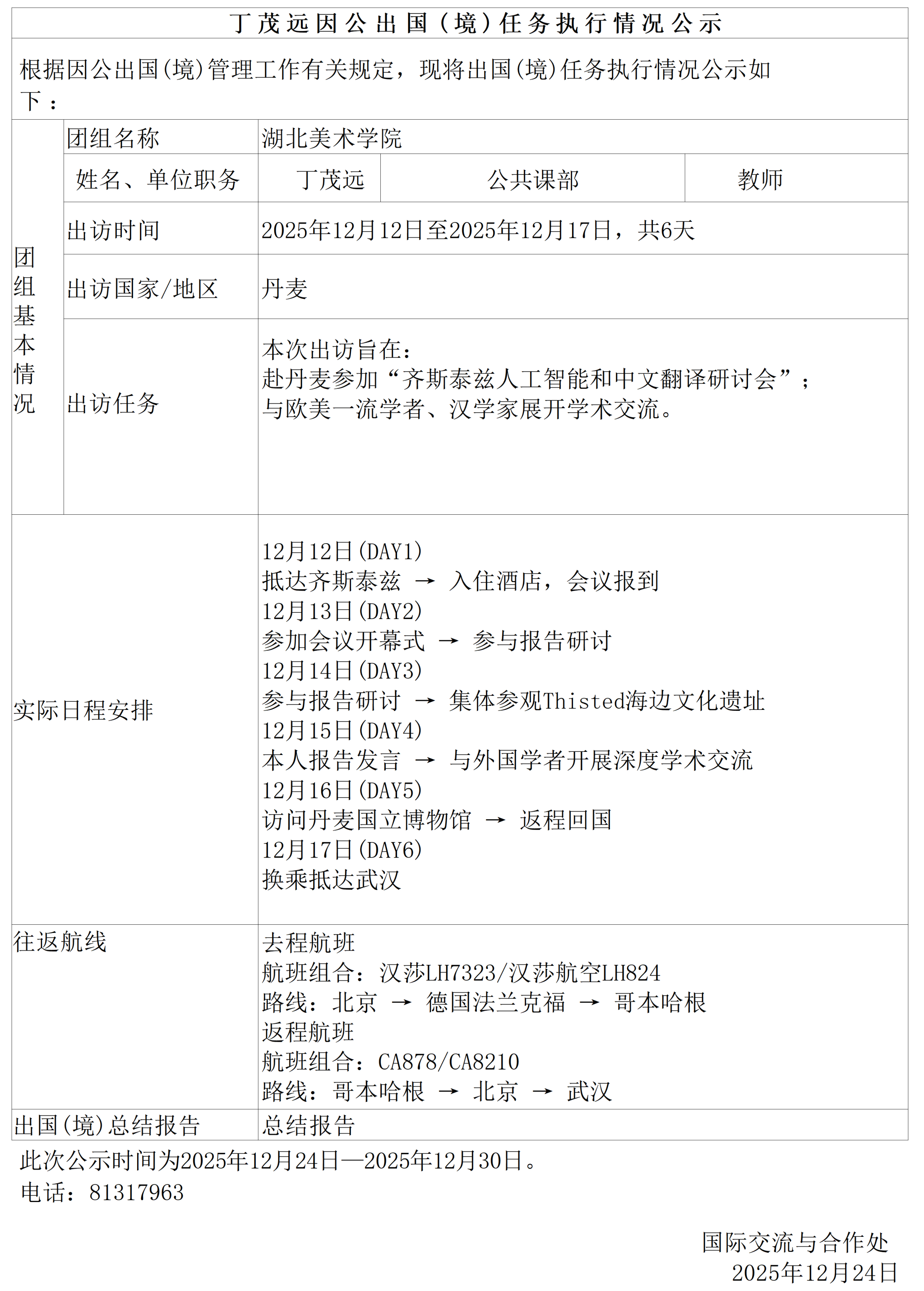 上一篇:湖北美术学院教职工因公出国(境)信息公示表(张炼)