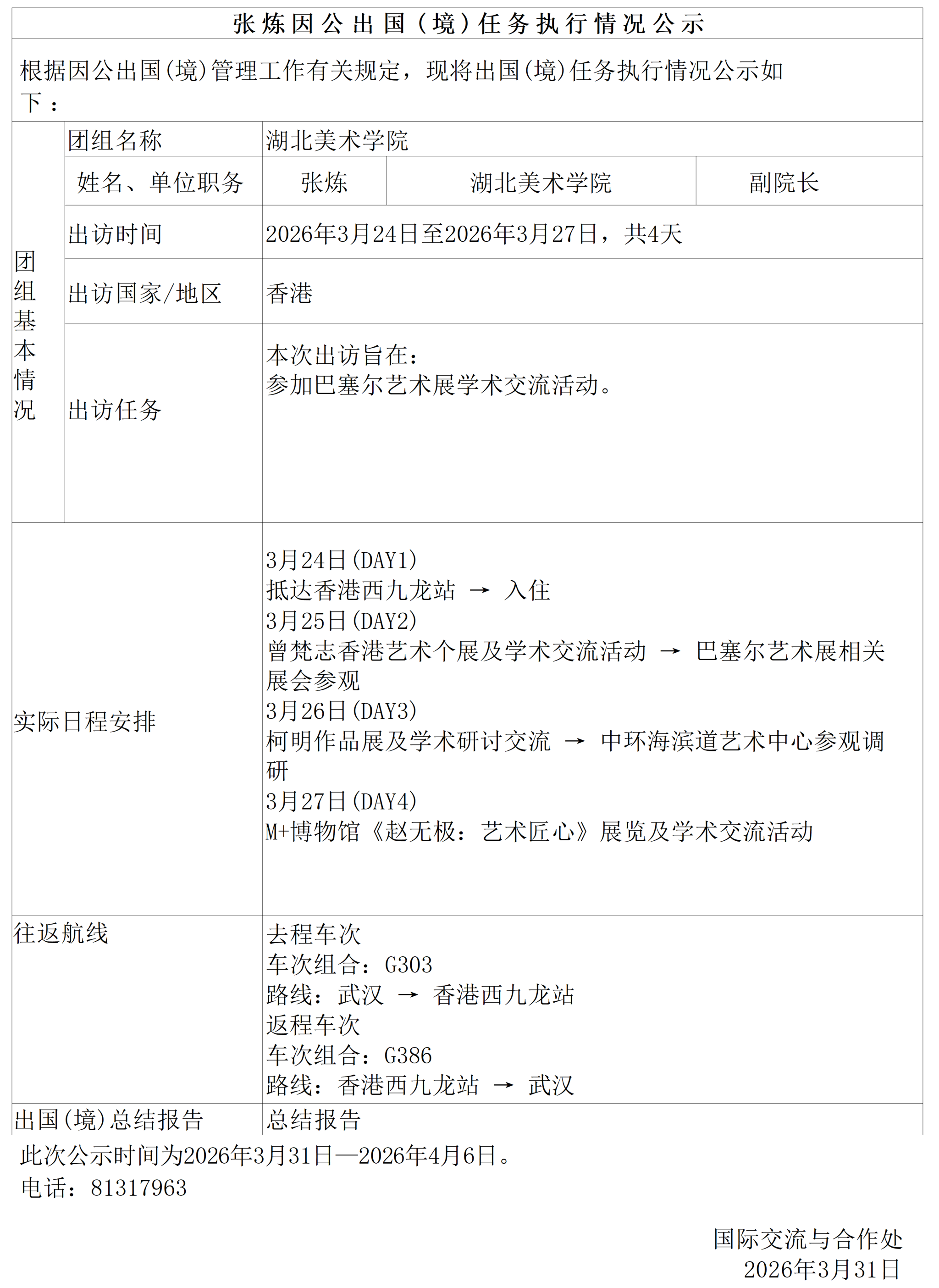 下一篇:湖北美术学院教职工因公出国(境)信息公示表(晏以晴)
