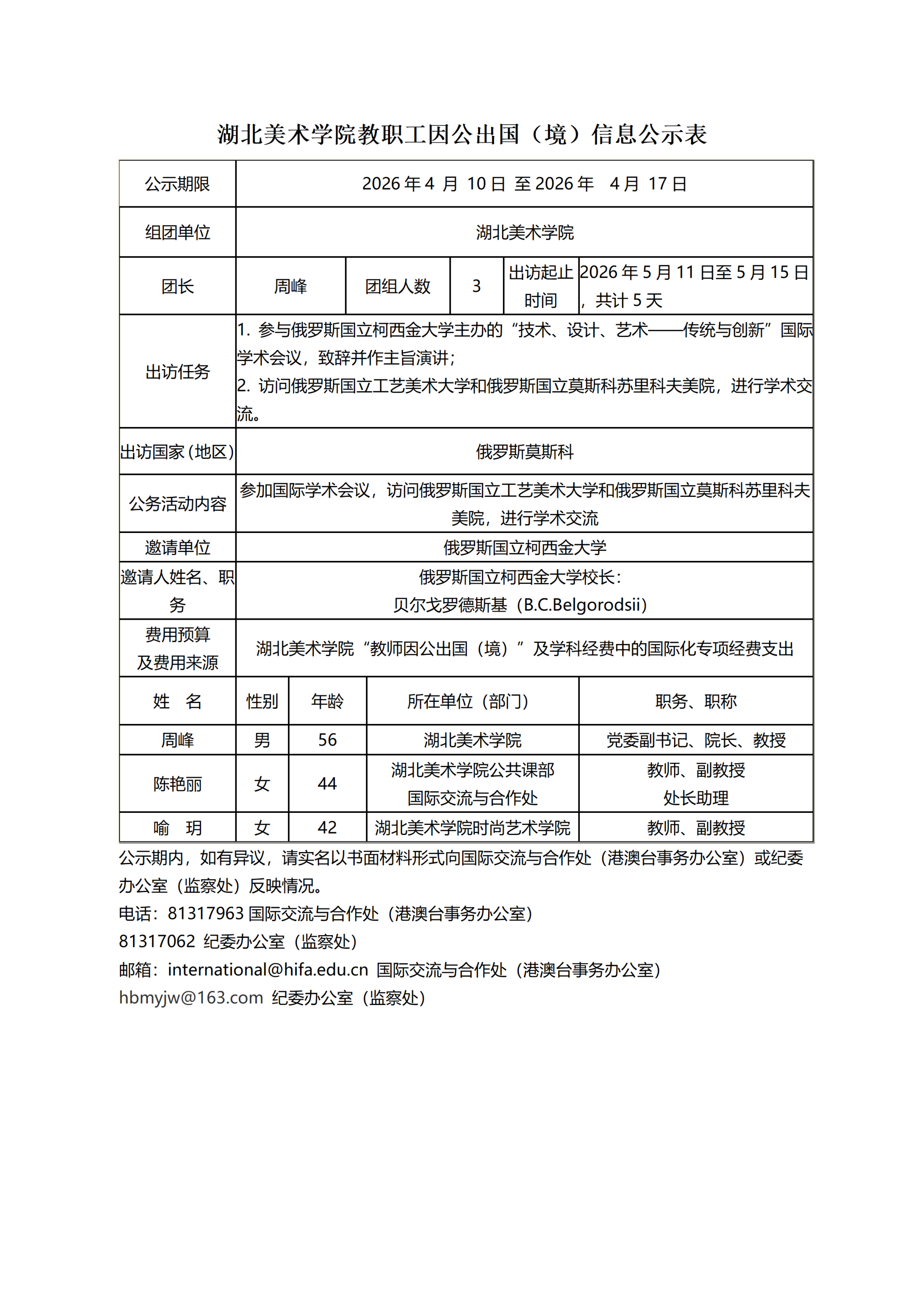 湖北美术学院教职工因公出国(境)信息公示表(周峰)