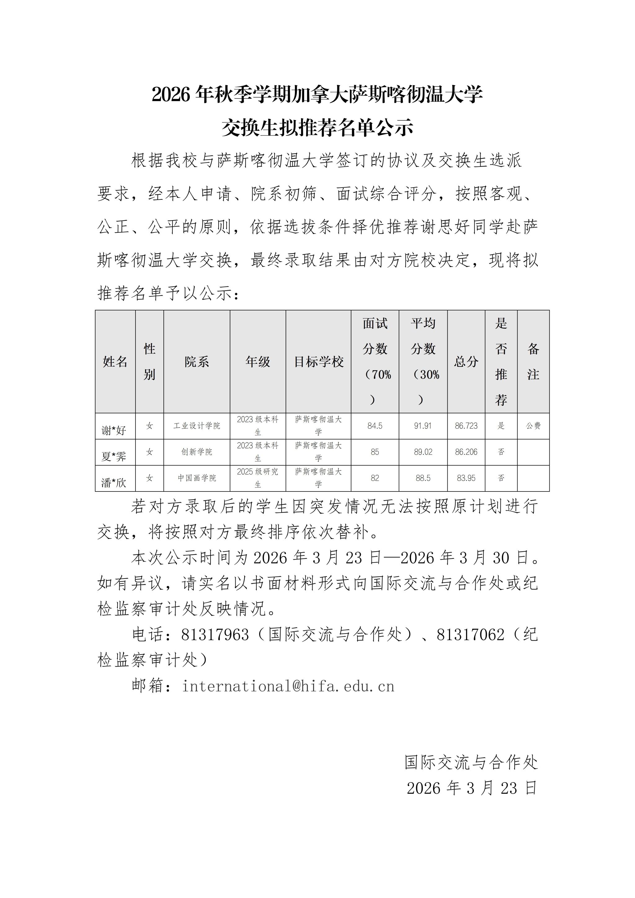 2026年秋季学期加拿大萨斯喀彻温大学交换生拟推荐名单公示